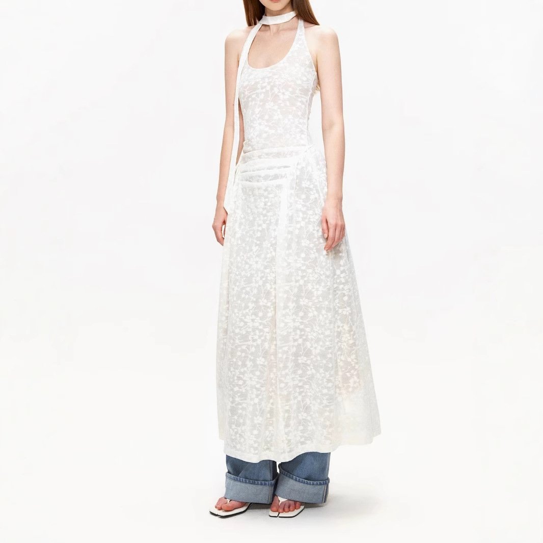 - Micro-transparent jacquard dress American hot girl sleeveless high-end vacation style halter neck floral layered long skirt