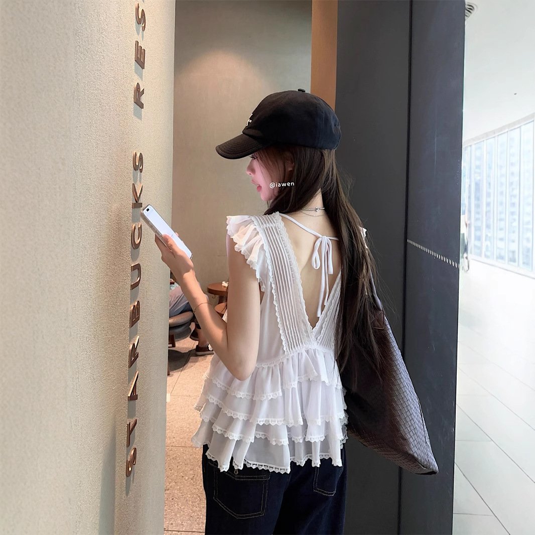 - Real photo of pure white ruffled lace shirt for women's summer design niche slim fit slim top